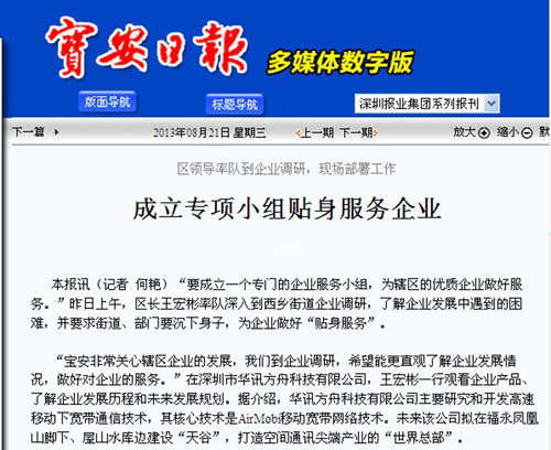 寶安區(qū)成立“華訊事務(wù)專項(xiàng)小組”,區(qū)長(zhǎng)親任組長(zhǎng)支持這家落戶寶安的先驅(qū)企業(yè)。該企業(yè)AirMobi技術(shù)解決了現(xiàn)在WIFI不能支持移動(dòng)寬帶上網(wǎng),這一移動(dòng)與帶寬沖突世界級(jí)技